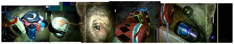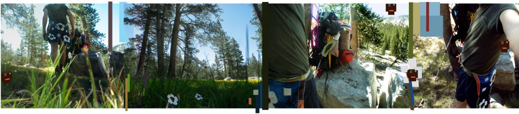 In the Kotawa Project photographic documentation I insert noise in the form of digital blocks of color reminiscent of glitches–these are notations that documentation is a slippery stand-in for the events wherein my art practice resides–these panoramics are fictions that freeze and layer time merge wilderness dream theater
