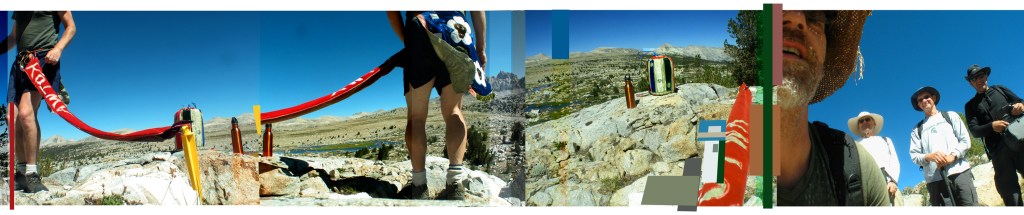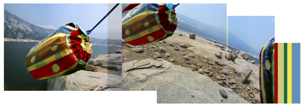To experience these documents in a gallery setting you are invited to swing the Chime-Can and wear the Kotwa Banner. Shift the Banner’s carabineer to your own belt. Dangle the Chime Can above ground features, and gently swing the can back and forth–dress yourself in headdress or loincloth and know that these things are both not and are the performed gestures of the Kotwa project just as the panoramic photographs are only approximations of the vistas, and environments in the Sierras. Your motions are yet transpiring within physical space and inseparable from local environment but like for me the art mark is not made upon or with this material—Through process and event, physical force and dream allow place to sculpt and reveal your I.